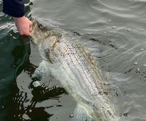 Captain Steve with a nice winter striper. Oooh, we can't…